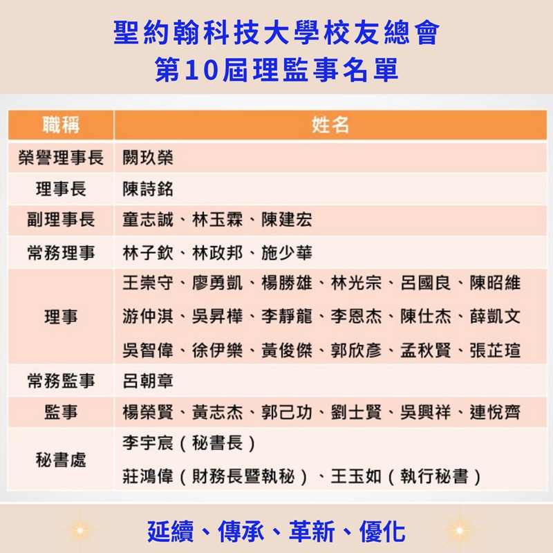 本會第10屆校友總會理事長為陳詩銘學長(72電機信),副理事長分別為童志誠學長(63機械忠)、林玉霖學長(70電機信)及陳建宏學長(71工程忠);秘書長則為李宇宸學長(77機械忠)。