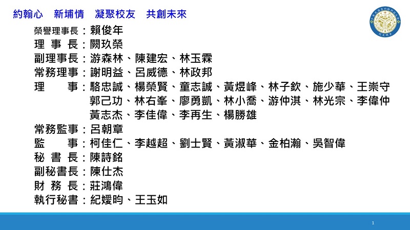 本會於2023年12月16日舉行2023校友年會,並進行第9屆理監事選舉,32位理監事當選名單如下。現任能麒企業(股)公司總經理的闕玖榮學長(68級電機信)當選校友總會第9屆理事長。