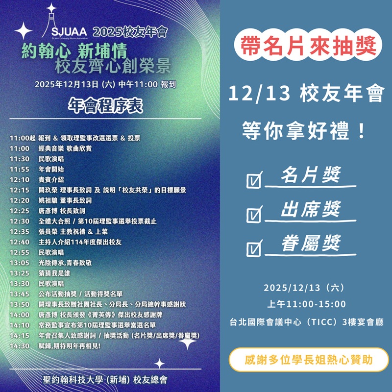 2025校友年會12月13日(六)上午11:00起於台北國際會議中心3樓宴會廳,我們不見不散唷!