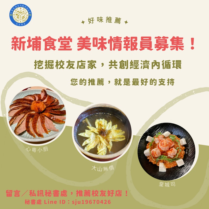 在此,秘書處誠摯邀請各位學長姐擔任「美味情報員」,無論是老牌古早味還是創新料理,只要是新埔/聖約翰校友經營的店家,都請推薦給我們。特派員將會安排現場踩點與深度報導,將好滋味介紹給廣大校友,讓我們挖掘更多校友好滋味,創造強大的校友支持圈!
