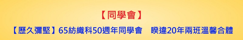 看著大家拉起紅布條,在鏡頭前開心留下珍貴的大合照,彷彿瞬間回到當年青春飛揚的校園時光。席間大夥熱絡地寒暄問候,分享著這些年來的生活點滴與無數回憶,50年的同窗情誼在歲月的洗禮下顯得更加珍貴與醇厚,相信這份溫暖的羈絆將會繼續陪伴著每位紡織科的校友。