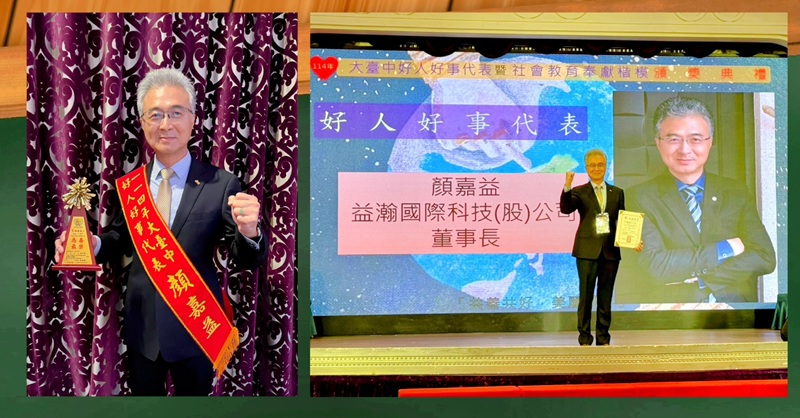 「大臺中好人好事代表暨年度全國社會教育奉獻楷模選拔頒獎典禮」10月24日假臺中市潮港城會館盛大舉行。益瀚國際科技 董事長顏嘉益學長(67機械信)長年以「取之於社會、用之於社會」的信念投身公益,榮獲「大台中好人好事代表」殊榮,展現出企業領袖兼具社會責任與教育關懷的典範風範。
